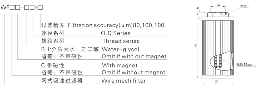 WF吸油过滤器是安装在油泵吸油口处,用以保护油泵及其他液压元件,以避免吸入污染杂质,有效地控制液压系统污染,调液压系统的清洁度。